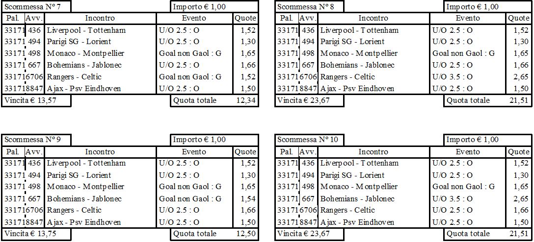 Il sistema condizionato non è ridotto. Bisogna quindi selezionare partite, dove ci sono alte probabilita che segnano entrambi e finiscano in Over. Se per esempio, tutte le partite terminano con n il risultato del 3-1 in su, tutte le bollette in gioco verranno centrate. Come accaduto nel nostro primo sistema pubblicato il 14 Aprile 2023.