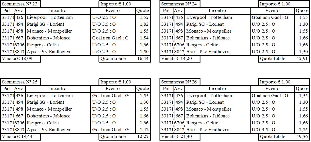 Sistema condizionato per scommesse di 6 triple in 33 colonne (33 BOLLETTE). Anzichè i classici 1 X 2, abbiamo messo in gioco su ogni evento, per comporre la tripla, i seguenti segni: Goal, Over2.5 e Over3.5